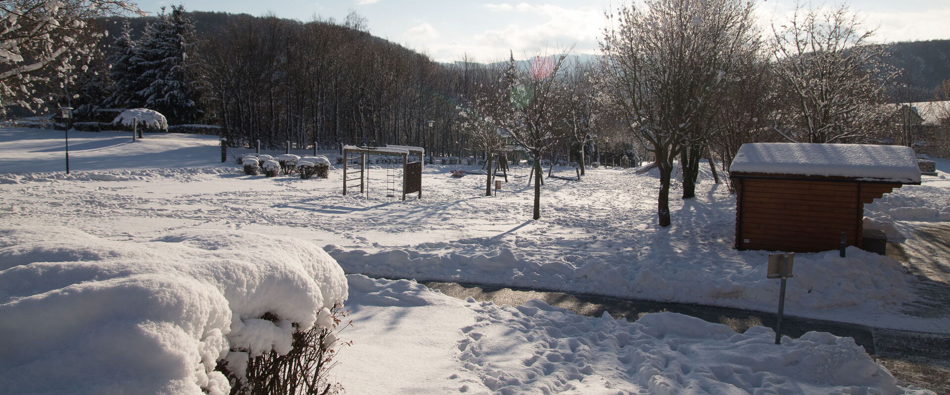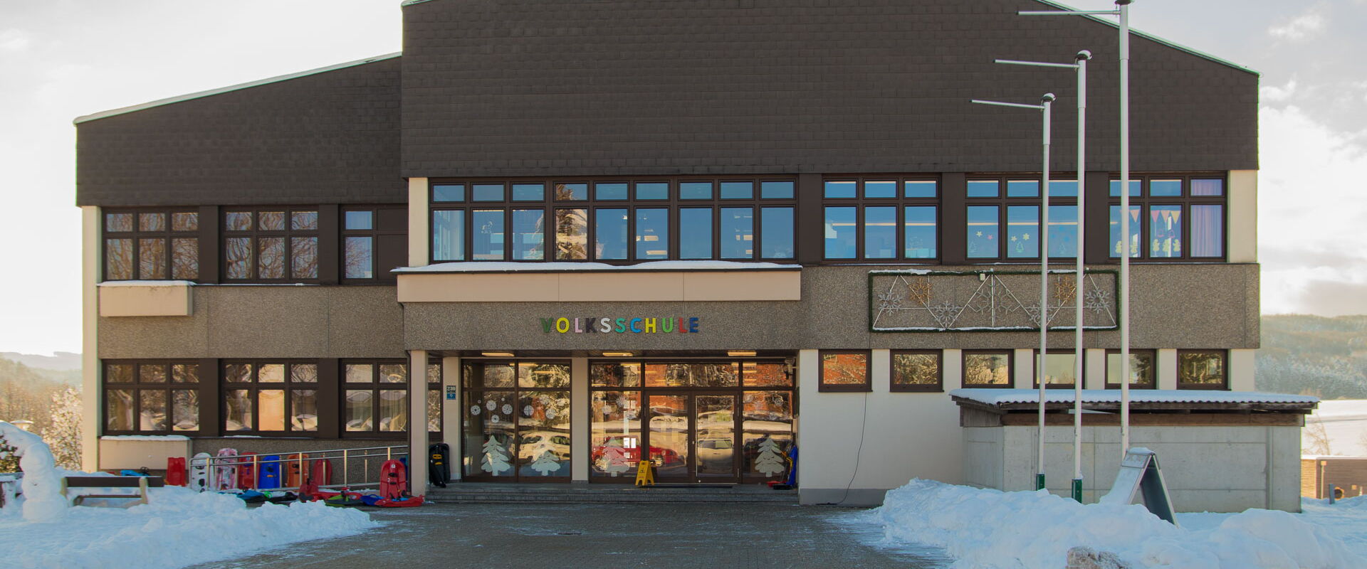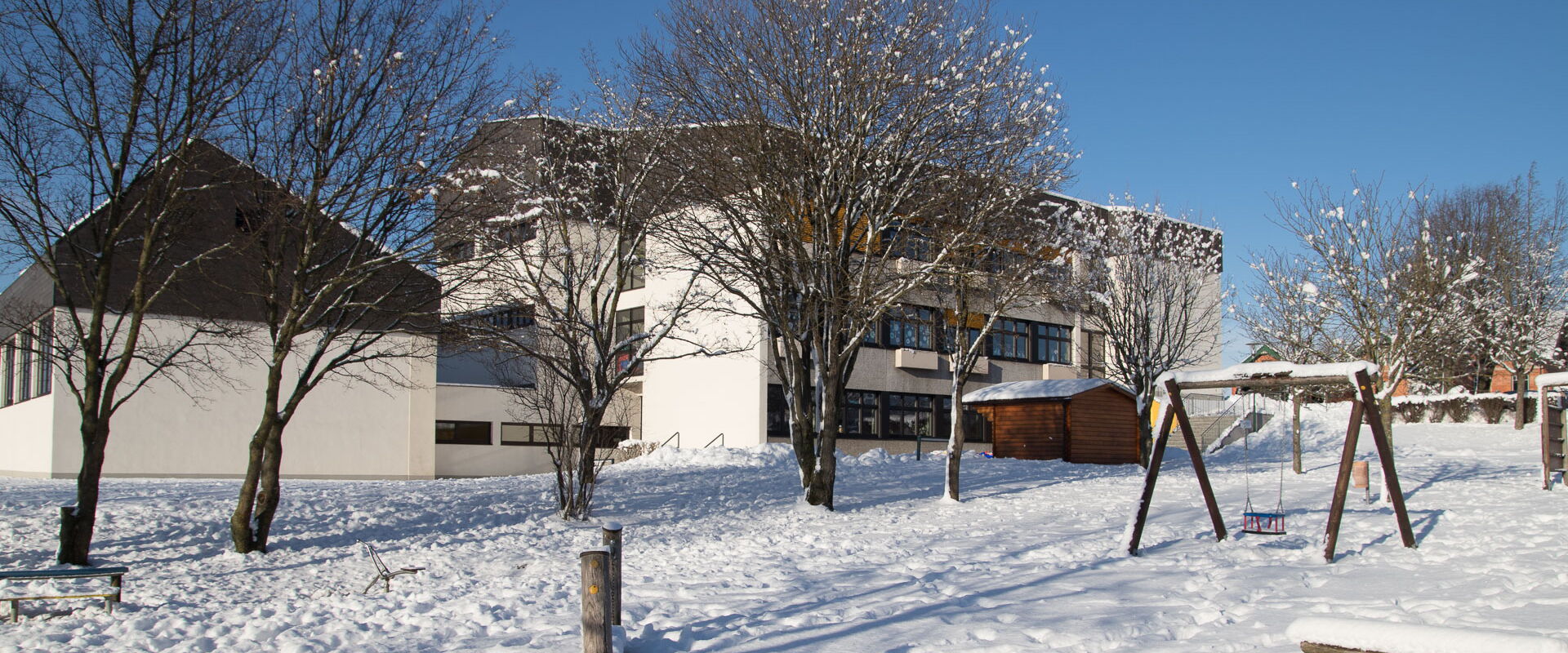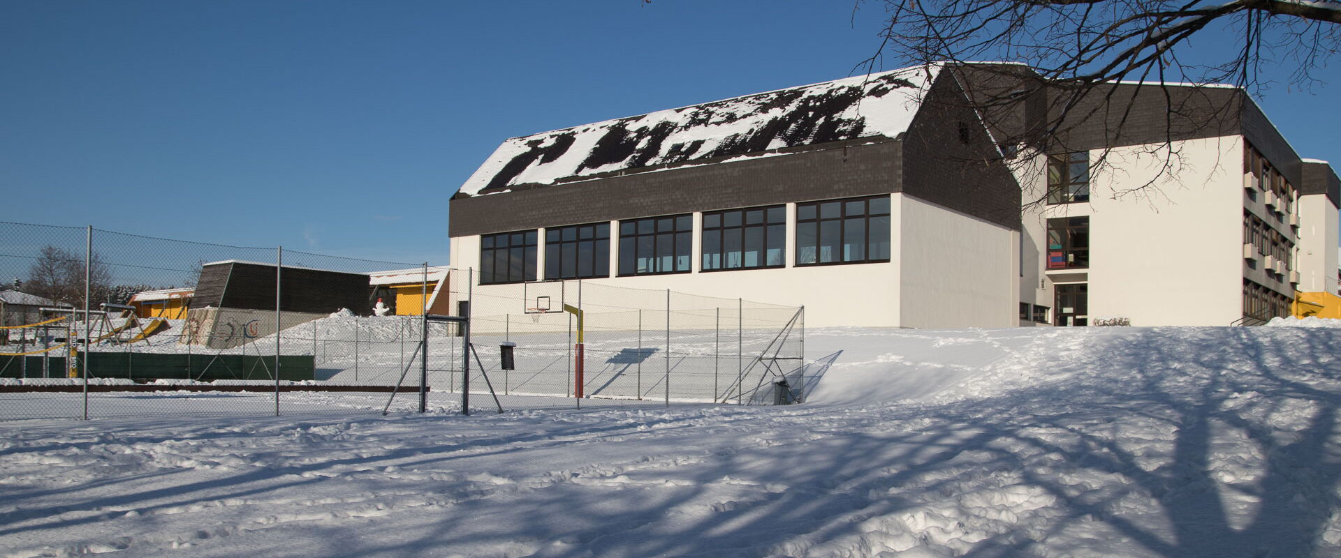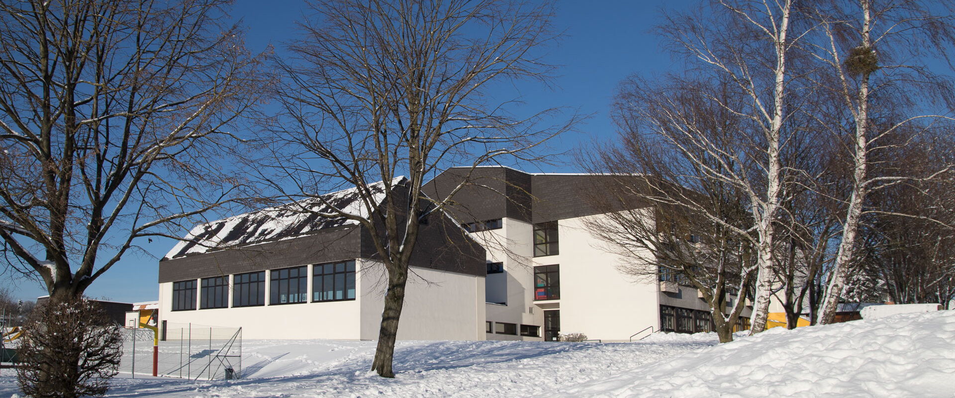 Die Schule verfügt auch über einen großen Turnsaal und über eine große Grünanlage im Freien mit Laufstrecke und Sprunggrube. Der weit gezogene Hügel am Ende der Wiese eignet sich hervorragend zum Bobfahren, damit auch im Winter so manche Turnstunde ins Freie verlegt werden kann.