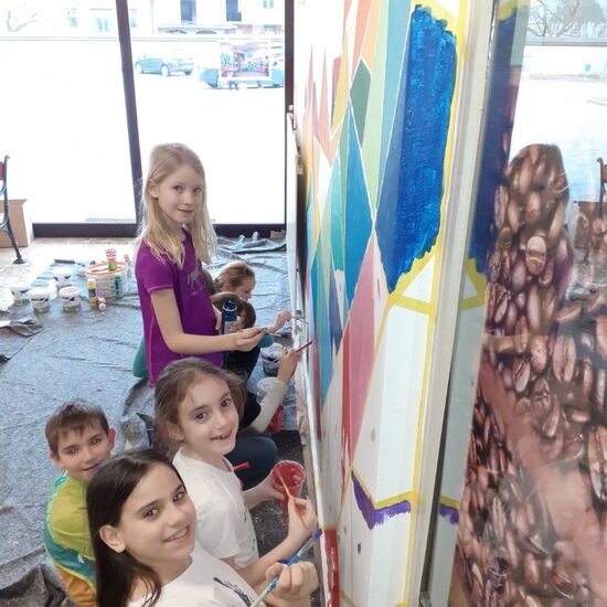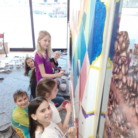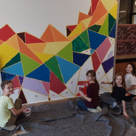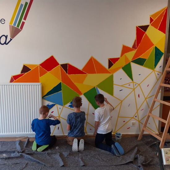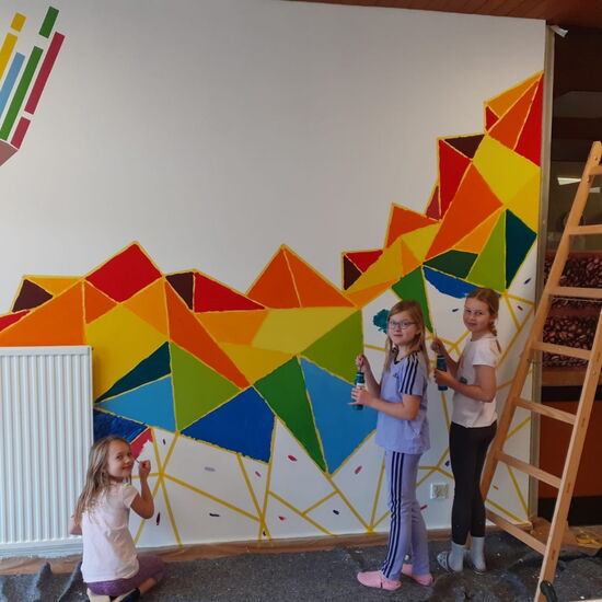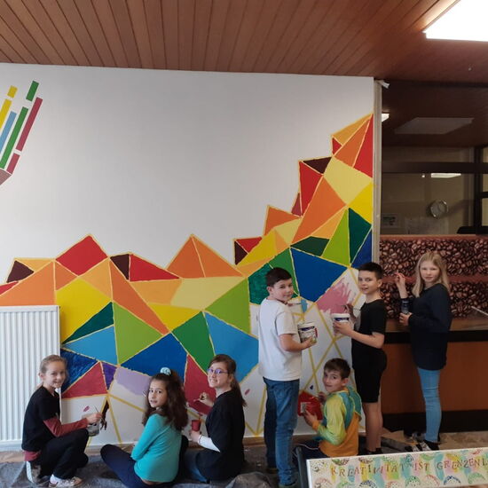 Nach viel Vorarbeit, die man auch auf den Fotos dokumentiert sieht (Logo malen, abkleben, Farben mischen etc.) durften sich die 4A und die 3B an dem Projekt beteiligen und die bunten Ecken ausmalen. So entstand gemeinsam dieses wunderschöne Ergebnis, auf das wir alle wirklich stolz sind! Vielen Dank Julia für deinen Einsatz, deine Mühen und diesen toll gestalteten Eingangsbereich, dem neuen Blickfang unserer Schule!