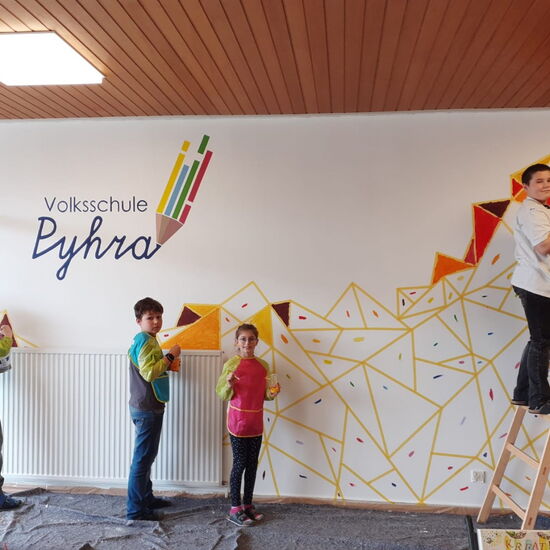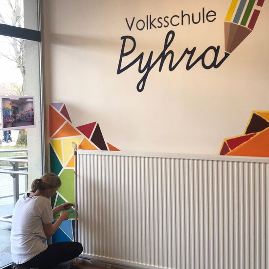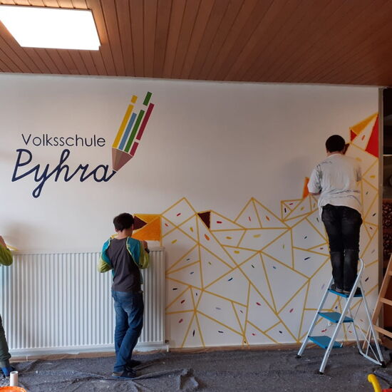 Vor einiger Zeit hatte unsere liebe Kollegin VL Julia Hochgerner die Idee, den Eingangsbereich der Schule umzugestalten. Nach einigen Recherchen und der Gestaltung eines neuen Schullogos, gab sie sich ganz der Planung und Durchführung ihres Projekts hin.