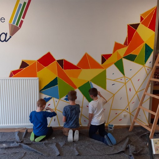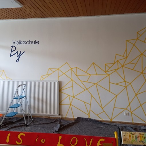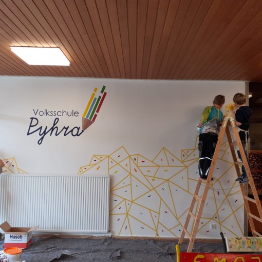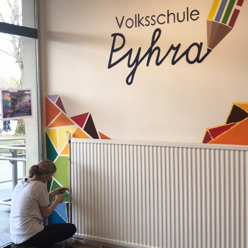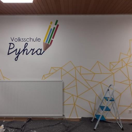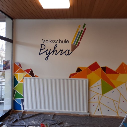 Vor einiger Zeit hatte unsere liebe Kollegin Julia Hochgerner die Idee, den Eingangsbereich der Schule umzugestalten. Nach einigen Recherchen und der Gestaltung eines neuen Schullogos, gab sie sich ganz der Planung und Durchführung ihres Projekts hin. Nach viel Vorarbeit, die man auch auf den Fotos dokumentiert sieht (Logo malen, abkleben, Farben mischen etc.) durften sich die 4A und die 3B an dem Projekt beteiligen und die bunten Ecken ausmalen. So entstand gemeinsam dieses wunderschöne Ergebnis, auf das wir alle wirklich stolz sind! Vielen Dank Julia für deinen Einsatz, deine Mühen und diesen toll gestalteten Eingangsbereich, dem neuen Blickfang unserer Schule!
